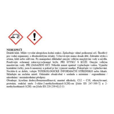 Obsahuje: aniontové povrchovo aktívne látky: ≥ 30 %; neiontové povrchovo aktívne látky: 15 – < 30 %; enzýmy; parfemy; konzervačné činidlá (methylchloroisothiazolinone, methylisothiazolinone); farbivá (CI 19140, CI 42040).